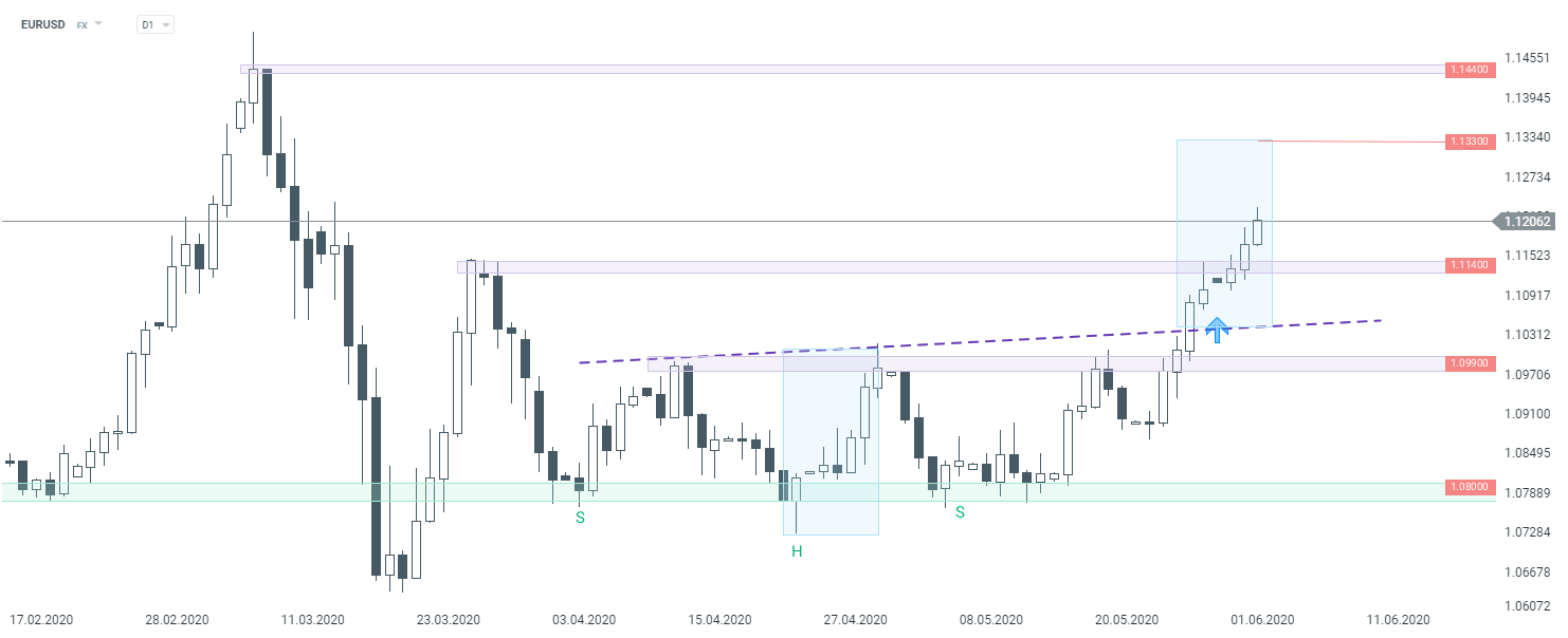 Kezdjük mai elemzésünket a legfőbb devizapárral. Napos időkeretben nézve látható, hogy az EURUSD egy fordított fej-váll alakzat nyakvonalát áttörve a korábbi szinteknél magasabban forog. A klasszikus technikai elemzés szerint a felfelé tartó mozgás a kék négyzet felső határát is elérheti, ami a kitörés potenciális tartományát jelöli (1.1330-nál). A másik oldalról, korrekció esetén az 1,1140 körüli terület - amit az árfolyam tegnap tört át - szolgálhat a legközelebbi támaszként. A hangulat ugyanakkor továbbra is bullish, így a felfelé tartó mozgás folytatódása a valószínűbb.