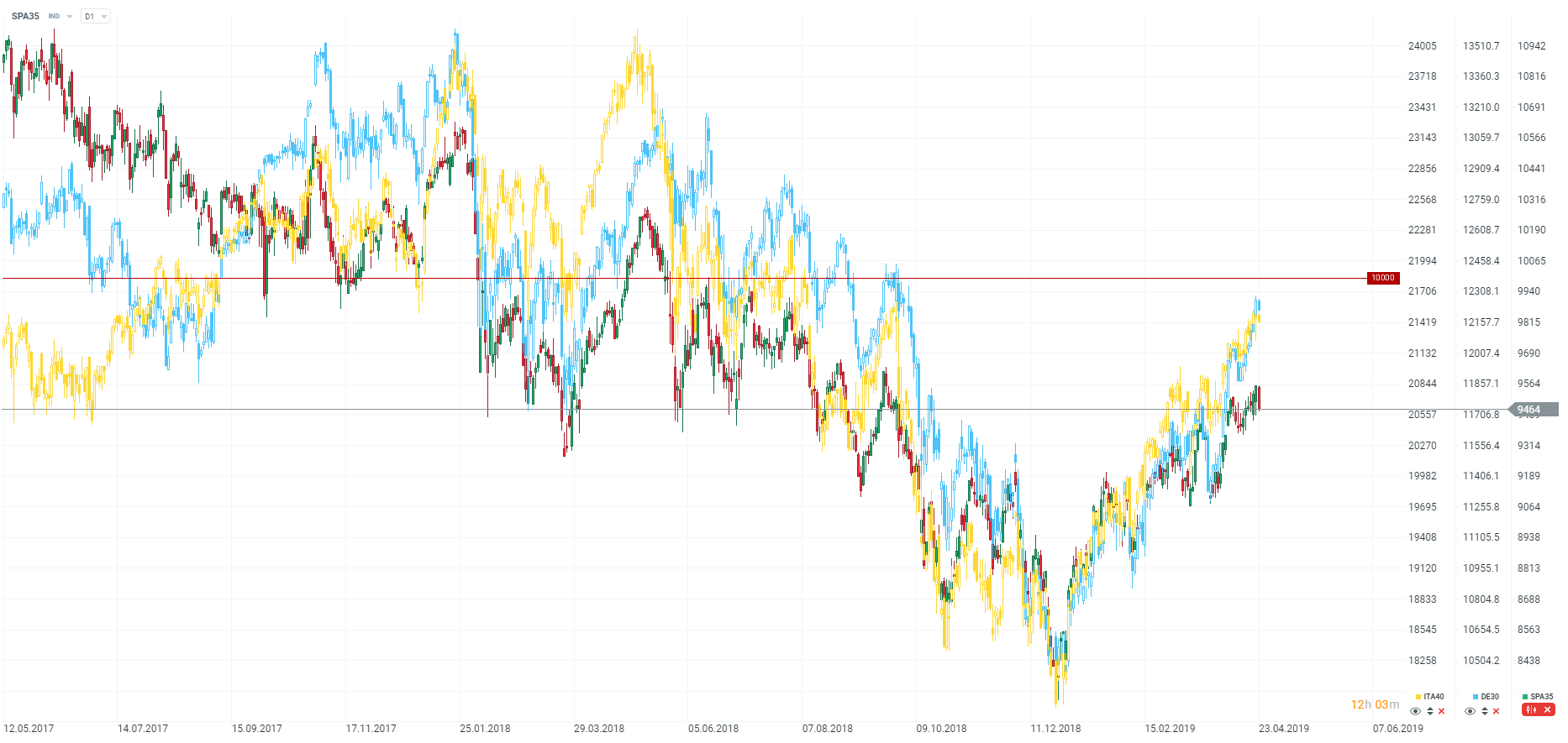 Az elmúlt napok során a spanyol IBEX folyamatosan vált váltva emelkedett a többi részvény piaccal. A teljesítmény azonban gyengébb volt a német DAX-hoz vagy az olasz FTSE MIB-hez képest. Tekintettel arra, hogy a politikai háttér Spanyolországban jobbnak tűnik, mint Olaszország, páran úgy vélhetik, hogy az SPA35 képes less betölteni a gepet amely távol tartja társaitól.
