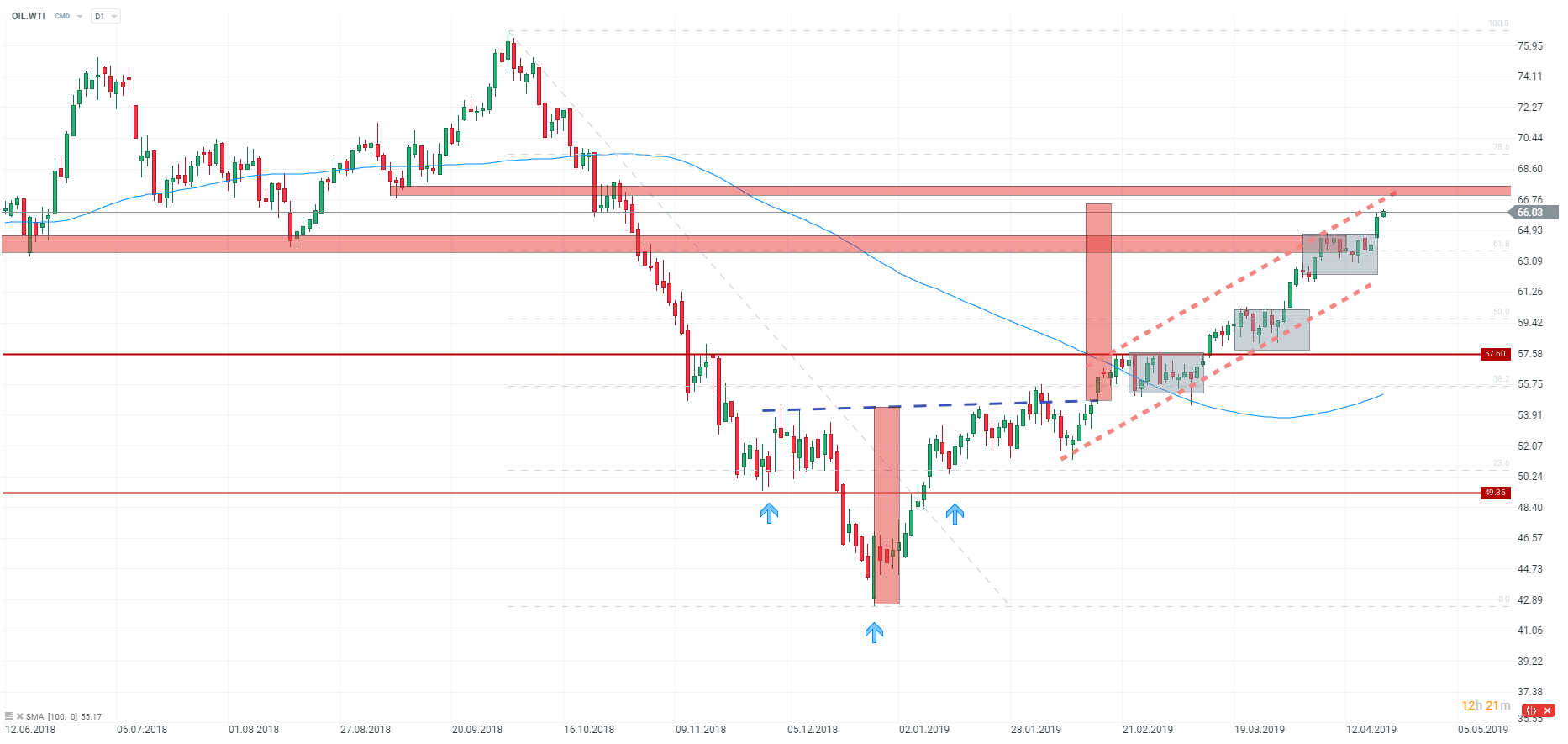 A kérészéletű konszolidáció után az olaj visszaváltott bika sebességre. Ez részben a Fehér Ház határozatának köszönhető. Nevezetesen Donald Trump úgy döntött, hogy megszünteti az iráni nyersolajat vásárló országok mentességét a rájuk vonatkozó szankciók terén. Rövid távon ez a döntés csökkentheti a kínálatot. Szaúd-Arábia azonban már felajánlotta kitermelésének növelését, hogy ellensúlyozza az iráni olaj kiesését. Ez a történet a Ez rövid távon pozitív lehet az árakra, bár kétségeink vannak egy esetleges hosszabb távú rally-t illetően. Technikailag a WTI árai folyamatosan emelkedik, és közeledik egy fordított fej-váll alakzathoz.