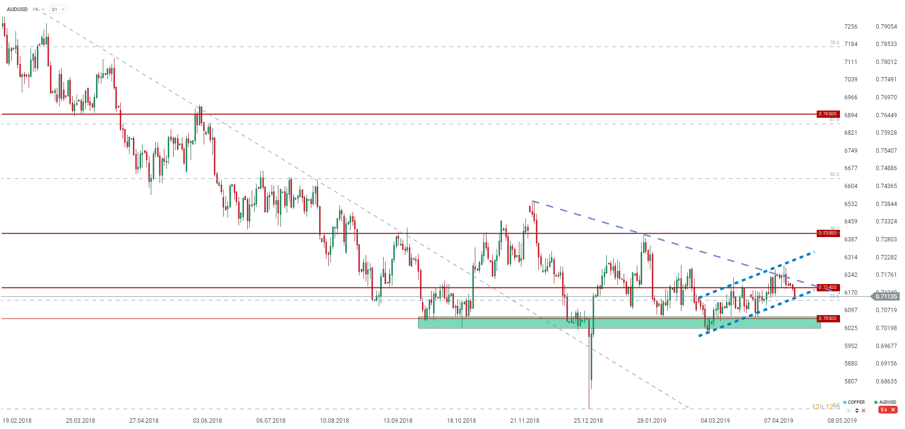 Aussie a közelmúltban elveszítette lendületét, köszönhetően az RBA által küldött dovish füstjeleknek. Úgy véljük azonban, hogy a várakozások a kamatcsökkentésre vonatkoznak túlzottak. Goldman Sachs szerint a jobb kockázati hangulat az Aussie dollár iránti nagyobb kereslethez vezethet. Eközben a vasérc ára már 100 dollár alatt. Technikailag a pár a 23,6%-os retracement szint közelében a bullish csatorna alsó határánál, ami egy fontos támasz zóna. A Egy kitörés a 0,7140-es szintről elindíthatja a bika csordát a 0,73 szintig.