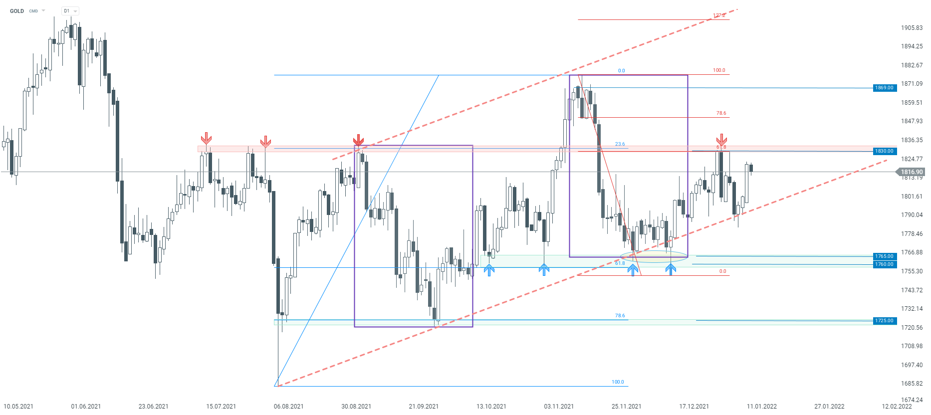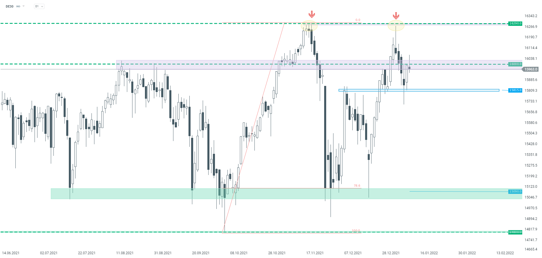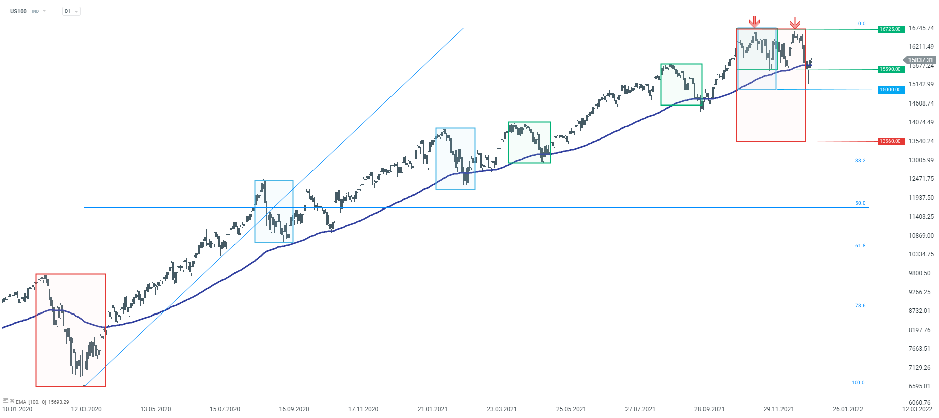 Let’s start today’s analysis with the US tech index - Nasdaq-100 (US100). Looking at the D1 interval, it may seem that despite recent pullback, there is no reason to panic yet. Index fell below the 100-period moving average, but quickly recovered. Buyers appeared below the 100-period moving average which acted as a key support in the past. Every drop near the purple line on the chart below (EMA100), led to a rapid rebound and movement to new record highs. Assuming that index recovers from its recent drop, the area near all time highs at 16,725 pts is a key resistance to watch. On the other hand, in case downward correction deepens, the nearest important support can be found at the lower limit of the blue rectangle near the level of 15,000 points, which marks the range of the largest correction during the whole pward impulse started in March 2020. If this level is breached, the next porential t support can be found with range of the plunge from the beginning of 2020 (marked in red).