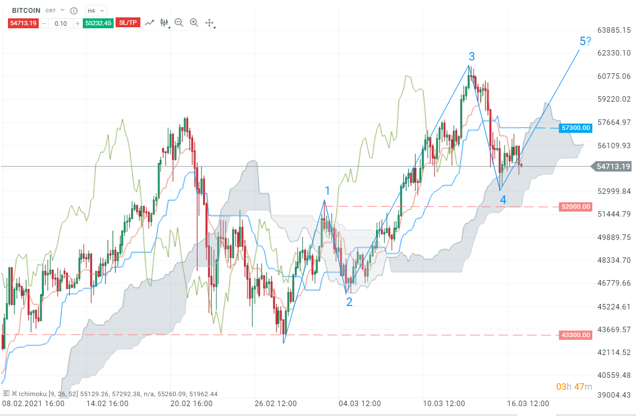 This short interval gives us a more complete picture of the actual technical situation on Bitcoin. After the bull trap, prices found support on the H4 Ichimoku cloud, trying to end a 4th wave above $53000. If prices manage to rise above the ichimoku cloud and break the Kijun-line at $57300 (blue line), the upward will be able to resume for a 5th wave to new highs. However, if prices break below the high of the first wave around $52000, breaking the cloud from below at the same time, the decline may deepen to $43300. Notice that this level coincides with the lower limit of the daily Ichimoku cloud and is located around the weekly Tenkan-line.