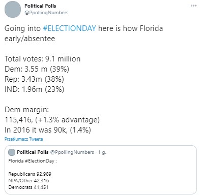 Florida is one of the must-win states for Trump and it will be one of the earliest states to release meaningful results. Little wonder it’s in the spotlight. As Political Polls reports over 9 million people have already voted and Dems have a slim 1.3% advantage. It’s understood that Dem voters mostly vote via mail (so already voted) and Rep voters will show up personally. Advantage Trump then? Bit early to tell – keep in mind this is just party affiliation – Republicans can vote Biden too! (and vice-versa).