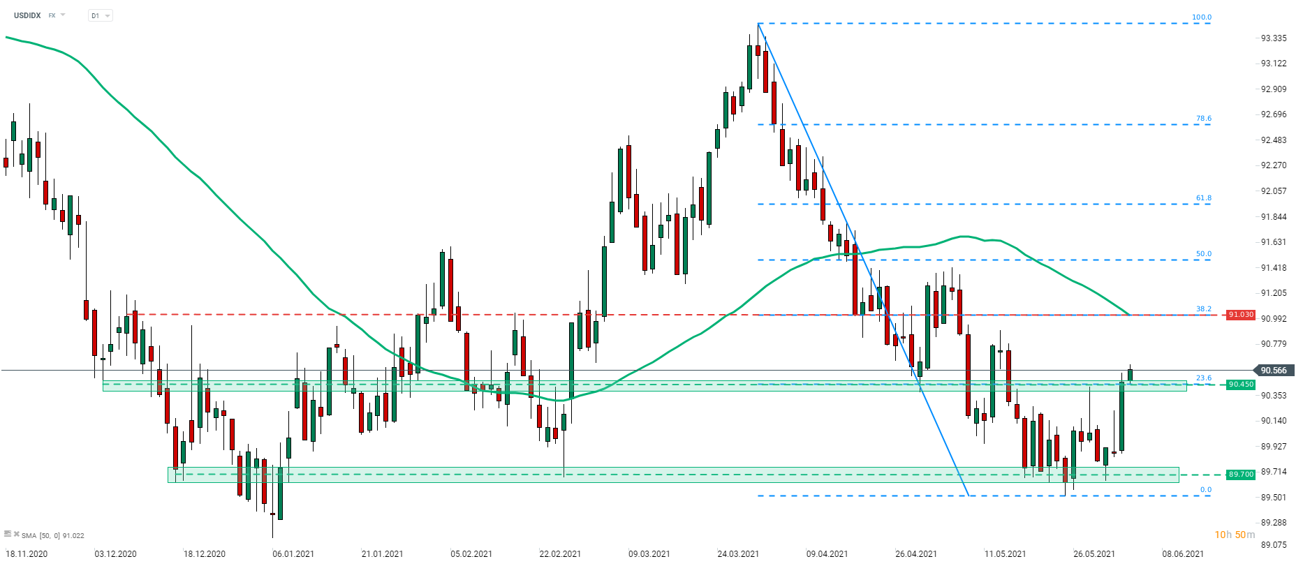 Az amerikai dollárindex (USDIDX) tegnap erős emelkedést produkált, és a 90,45-ös árfolyam fölé tört át. Az index ma csak enyhén emelkedik, mivel a befektetők az amerikai munkahelyi adatok közzétételére várnak (14:30). A közeli ellenállás 91,03-nál található, és az 50-es mozgóátlaggal és a 2021 március végén kezdődött lefelé irányuló mozgás 38,2%-os retracementjével van jelölve, ez utóbbi a 2021 március végén kezdődött lefelé irányuló mozgás 38,2%-os retracementje. Forrás: xStation5