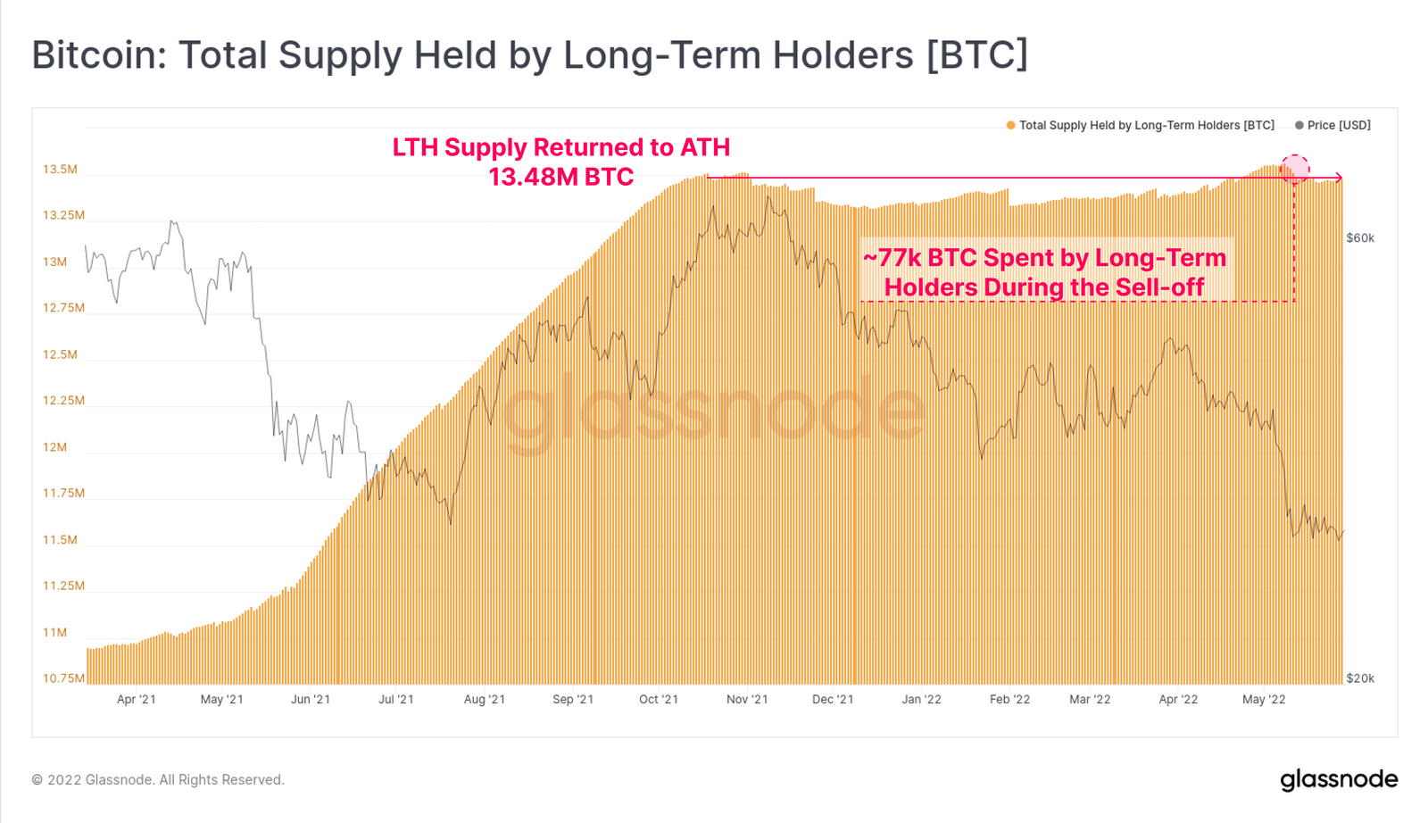The total supply of bitcoin at the addresses of long-term investors (not selling faster than after 1 year) has recently stabilized. Typically, long-term investors are willing to accumulate when the Bitcoin price consolidates. Bitcoin supply held by long-term recently returned to record levels near 13.48 million BTC. Despite bullish signs of generally positive sentiment among long-term investors, still some such addresses are realizing losses. At the end of May, the average loss realized by such addresses was about 27% against the moment of purchase. Such situations in the past occurred only during the lows and capitulations during the bear markets in 2018 or March 2020, among others, and confirm the extremely negative sentiment that is shared even by a part of long-term investors expecting price declines. This confirms that current levels may still be attractive for contrarian investors but further downward movement is still definitely in play. Source: Glassnode