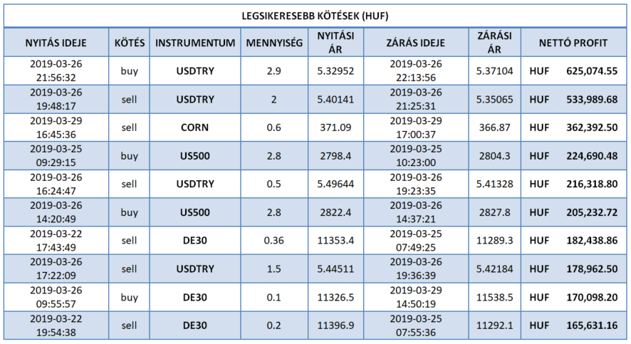 Magyarország legjobb kötése múlthéten az XTB berkein belül 1 281 626 forintot (€ 4 004,28) hozott a tulajdonosának éles számlán, befektetését napon belül zárta az Arany (Gold) instrumentumon. A kötés 3 lottal történt. Eladási (sell) pozíciót befektetőnk csötörtökön (2019-03-28) a 1308.16-os szinten vette fel, majd aznap zárta profittal a 1293.18-as árszinten. A Gold 14,29 pip-es elmozdulását csípte el kereskedőnk. Gratulálunk szép munka! Vajon ki lesz a jövöheti győztesünk?