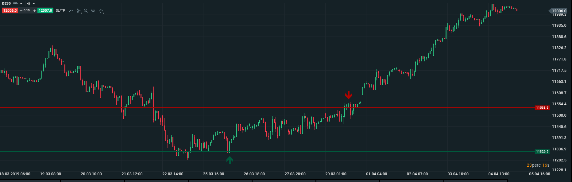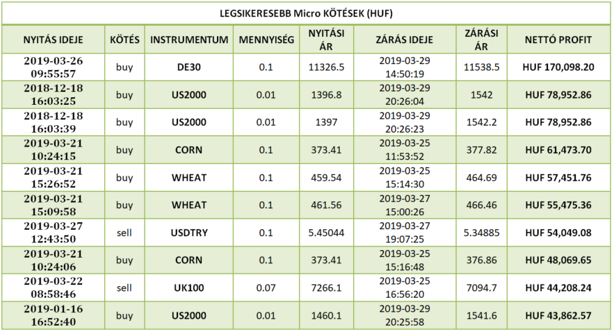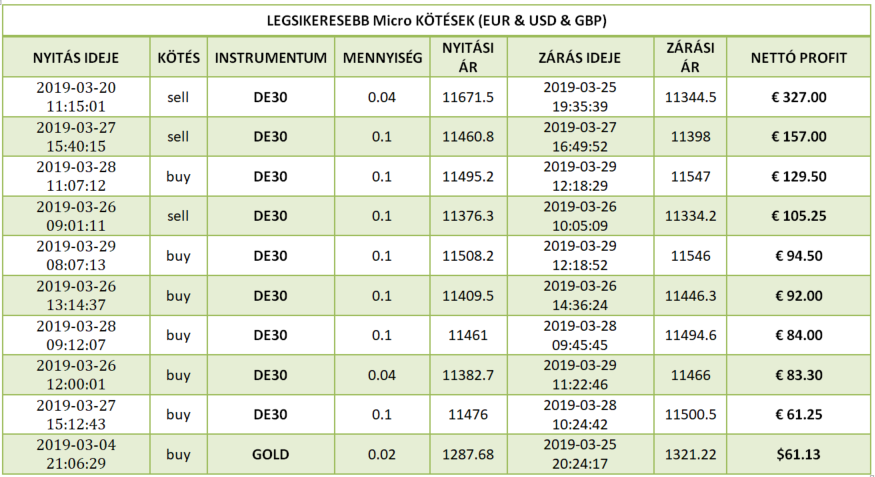 Magyarország multheti különdíjas kötése az XTB-nél 170 098,20 forintot (€ 531.58) hozott a tulajdonosának éles számlán, befektetését 4 napig tartotta a DAX (DE30) instrumentumon. A kötés 0.1 lottal történt. A vételi (buy) pozíciót befektetőnk kedden (2019-03-26) a 11326.5-ös szinten vette fel, majd csütörtökön zárta (2019-03-29) profittal a 11538.5-ös ár szinten. A DAX 212 pip-es elmozdulását csípte el kereskedőnk. Gratulálunk szép munka! Vajon ki lesz a jövöheti Micro győztesünk?