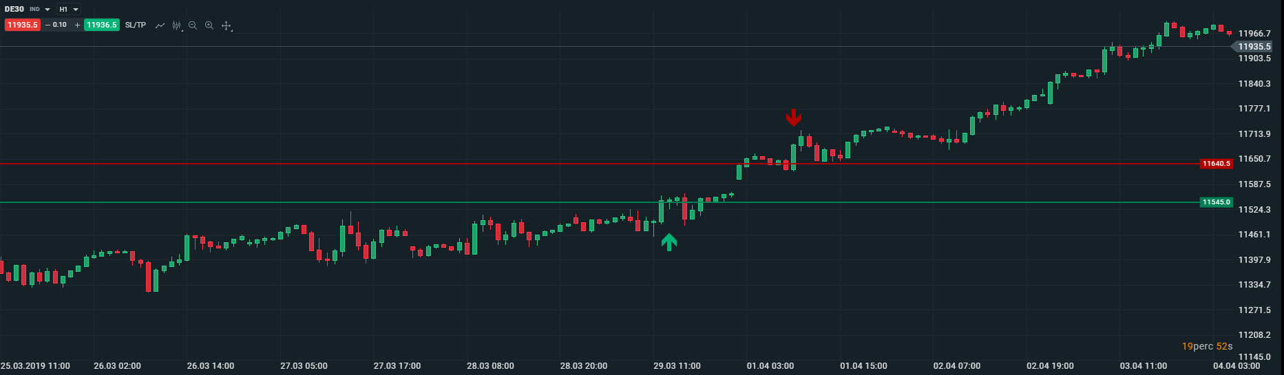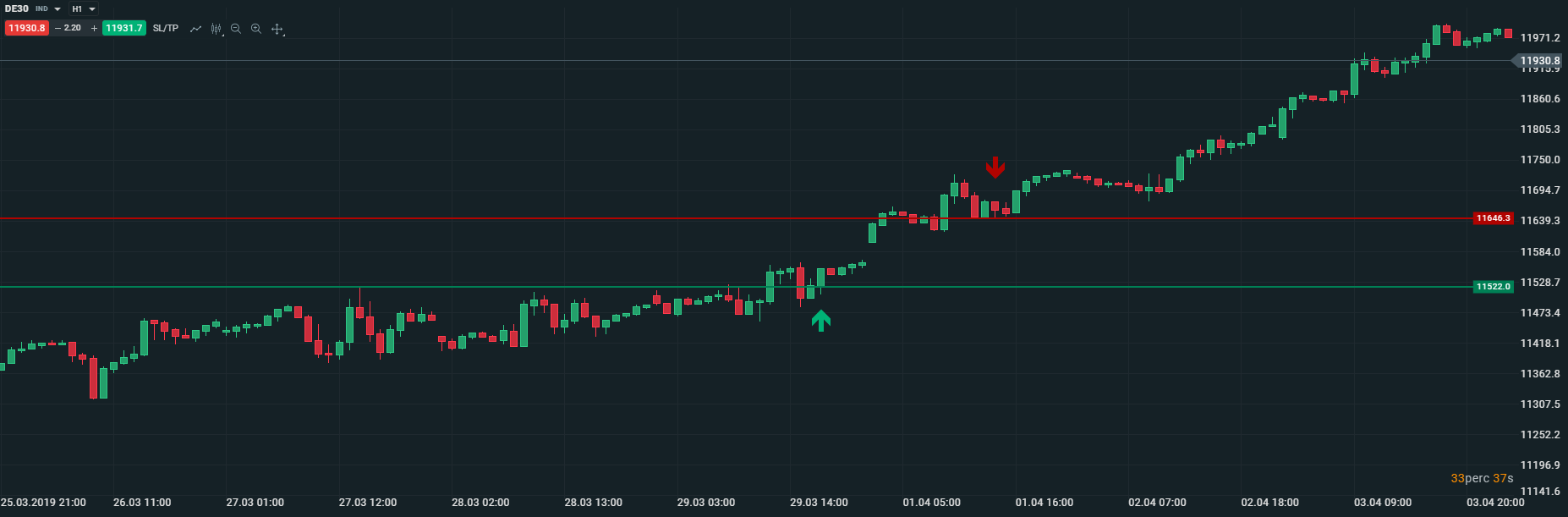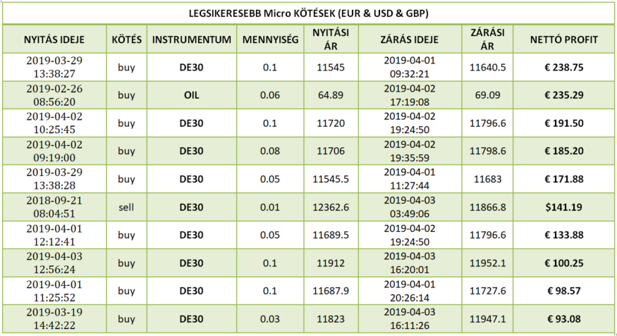 Magyarország multheti különdíjas kötése az XTB-nél 75 531,84 forintot (€ 238,75) hozott a tulajdonosának éles számlán, befektetését 3 napig tartotta a DAX (DE30) instrumentumon. A kötés 0.1 lottal történt. A vételi (buy) pozíciót befektetőnk pénteken (2019-03-29) a 11545-ös szinten vette fel, majd hétfőn zárta (2019-04-01) profittal a 11640.5-ös ár szinten. A DAX 95,5 pip-es elmozdulását csípte el kereskedőnk. Gratulálunk szép munka! Vajon ki lesz a jövöheti Micro győztesünk?