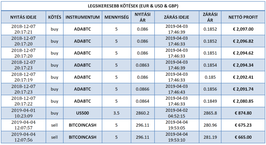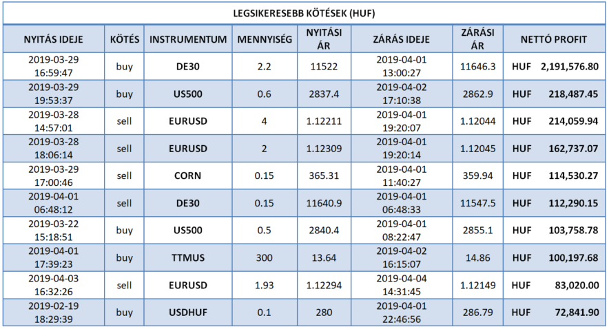 Magyarország legjobb kötése múlthéten az XTB berkein belül 2 191 576,80 forintot (€ 6927,40) hozott a tulajdonosának éles számlán, befektetését 3 napig tartotta az DAX (DE30) instrumentumon. A kötés 2.2 lottal történt. Vételi (buy) pozíciót befektetőnk pénteken (2019-03-29) a 11522-es szinten vette fel, majd hétfőn zárta (2019-04-01) profittal a 11646.3-as árszinten. A DAX 124,3 pip-es elmozdulását csípte el kereskedőnk. Gratulálunk szép munka! Vajon ki lesz a jövöheti győztesünk?