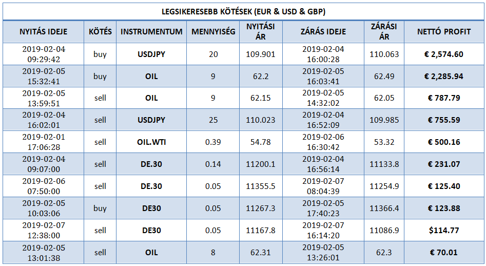 Magyarország legjobb kötése múlthéten az XTB berkein belül 4 508 975,10 forintot (14 171.84 EUR) hozott a tulajdonosának éles számlán, befektetését 18 napig tartotta nyitva az DE.30 (DAX) instrumentumon. A kötés 4 lottal történt. A vételi (buy) pozíciót befektetőnk pénteken (2019-01-18) a 11231.1-es szinten vette fel majd kedden zárta (2019-02-05) profittal a 11373.2-es ár szinten. A DE.30 141 pip-es elmozdulását csípte el kereskedőnk. Gratulálunk szép munka!