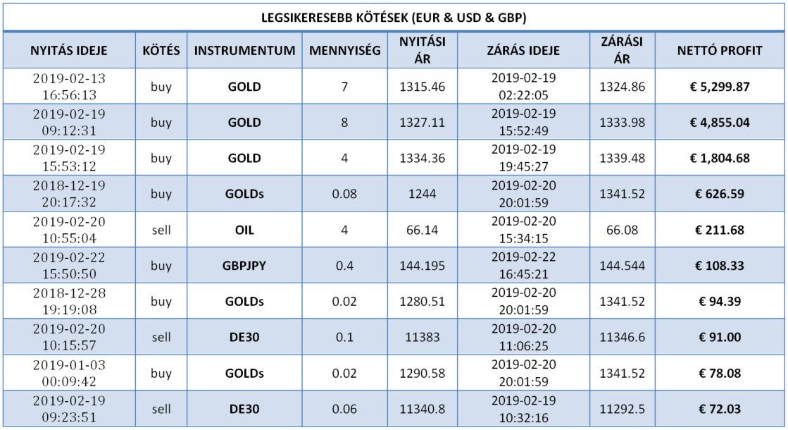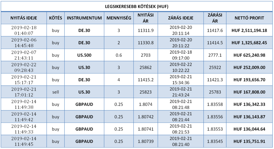 Magyarország legjobb kötése múlthéten az XTB berkein belül 2 511 194,18 forintot (7934,66 EUR) hozott a tulajdonosának éles számlán, befektetését 2 napig tartotta nyitva az DE.30 (DAX) instrumentumon. A kötés 3 lottal történt. A vételi (buy) pozíciót befektetőnk hétfőn (2019-02-18) a 11311.9-es szinten vette fel majd szerdán zárta (2019-02-20) profittal a 11417.6-os ár szinten. A DE.30 105 pip-es elmozdulását csípte el kereskedőnk. Gratulálunk szép munka! Vajon ki lesz a jövöheti győztesünk?