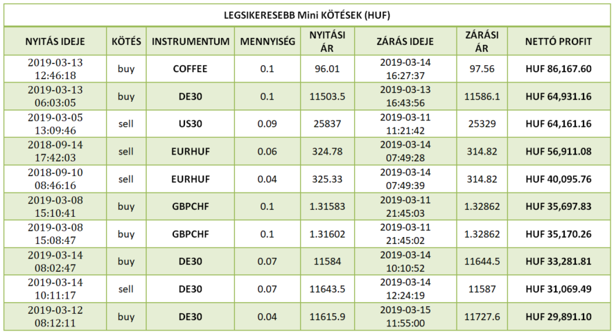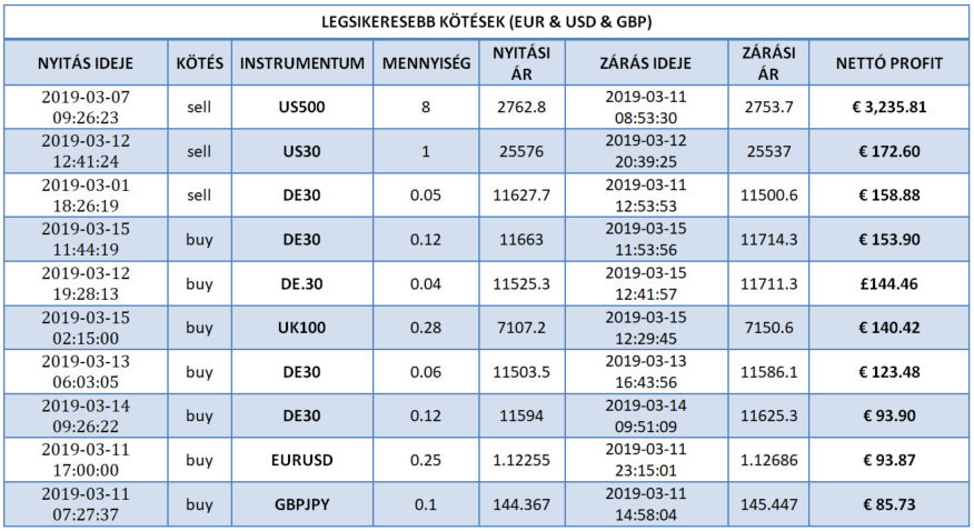 Magyarország legjobb kötése múlthéten az XTB berkein belül 1 013 488 forintot (€ 3,235.81) hozott a tulajdonosának éles számlán, befektetését majd 4 napig tartotta a US500 instrumentumon. A kötés 8 lottal történt. A eladási (sell) pozíciót befektetőnk csütörtökön (2019-03-07) a 2762.8-as szinten vette fel, majd hétfőn zárta (2019-03-11) profittal a 2753.7-es árszinten. A US500 9,1 pip-es elmozdulását csípte el kereskedőnk. Gratulálunk szép munka! Vajon ki lesz a jövöheti győztesünk?