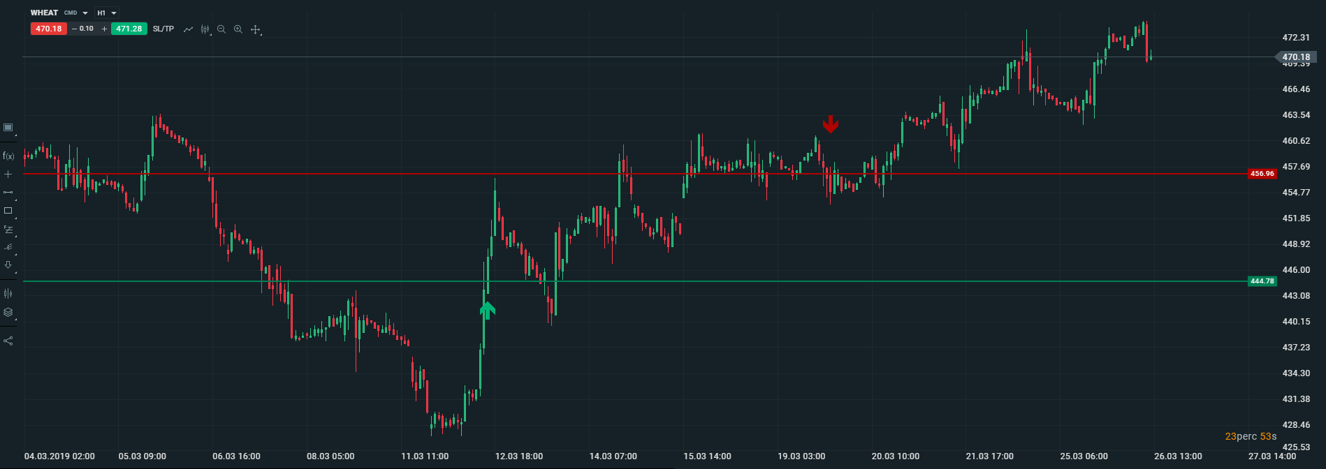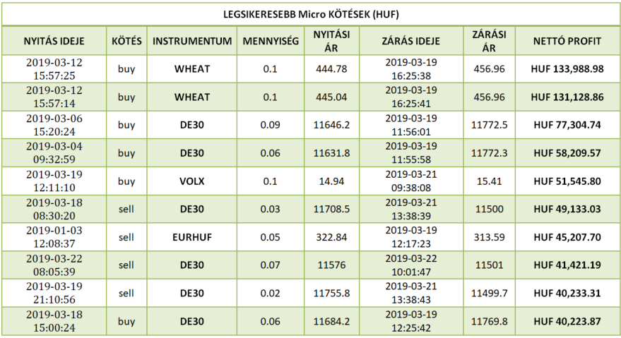 Magyarország multheti különdíjas kötése az XTB-nél 133 988.98 forintot (€ 424.26) hozott a tulajdonosának éles számlán, befektetését 7 napig tartotta a Gabona (WHEAT) instrumentumon. A kötés 0.1 lottal történt. A vételi (buy) pozíciót befektetőnk kedden (2019-03-12) a 444.78-as szinten vette fel majd kedden zárta (2019-03-19) profittal a 456.96-os ár szinten. A WHEAT 12,18-as elmozdulását csípte el kereskedőnk. Gratulálunk szép munka! Vajon ki lesz a jövöheti Micro győztesünk?