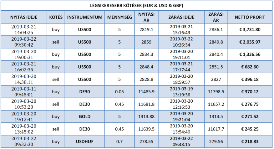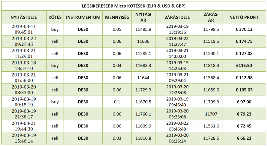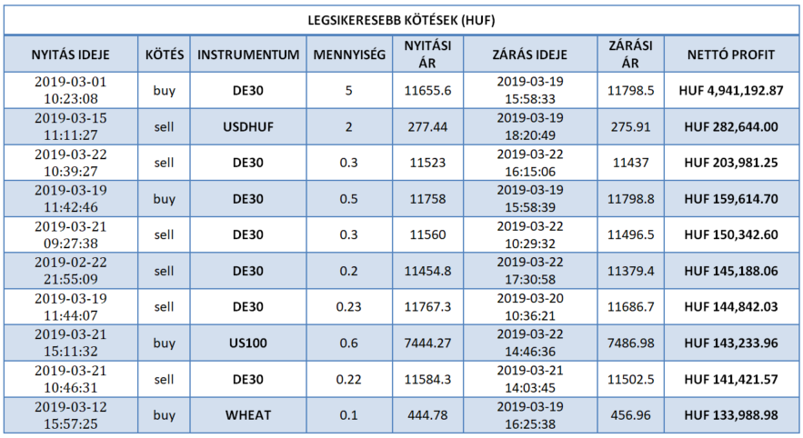 Magyarország legjobb kötése múlthéten az XTB berkein belül 4 941 192.87 forintot (€ 15 645,70) hozott a tulajdonosának éles számlán, befektetését 18 napig tartotta a DE30 instrumentumon. A kötés 5 lottal történt. A vételi (buy) pozíciót befektetőnk pénteken (2019-03-01) a 2762.8-as szinten vette fel, majd kedden zárta (2019-03-19) profittal a 11798.5-ös árszinten. A DAX 142,9 pip-es elmozdulását csípte el kereskedőnk. Gratulálunk szép munka! Vajon ki lesz a jövöheti győztesünk?