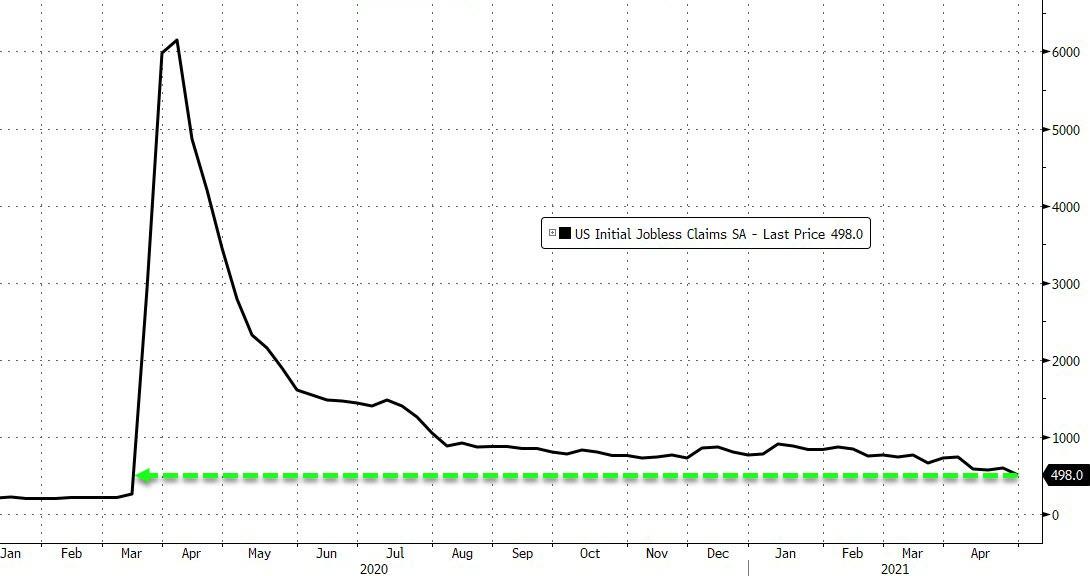 After yesterday's ADP report today investors’ attention focused on initial jobless claims print, which is often seen as another hint ahead of Friday's big payrolls data. Today's report showed that initial claims decreased to 498k in the week ended May 1 from upwardly revised 590k recorded in the previous week. Today's report came in below market estimates of 540k and is the lowest level since March 2020, when the pandemic first hit the US economy.