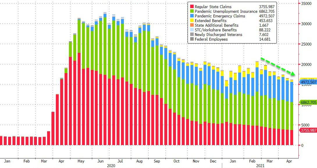 Sharpest declines were recorded in Virginia and New York, while only Kentucky reported a considerable increase. At first glance, one can come to the conclusion, the labor market recovery gains steam thanks to ongoing vaccine rollout and massive government financial support. However, continuing claims increased to 3.69 million, from a revised 3.65 million a week before, above market projections of 3.62 million. This was the second straight month of increase in continuing claims. Also the number of Americans which remain on some form of government jobless benefit fell by more than 404k, however still remains above 16 million.