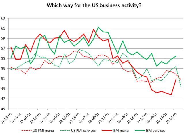 Az ISM beszerzési menedzser-indexek nagyon derűlátó hangulatot mutattak januárban, de a PMI üzleti bizalmi indexek (melyek rövidebb történeti időszakuk miatt kevésbé elfogadottak) egy éles romlást mutattak februárban. Ezért lesz az e heti ISM publikáció még a munkaerőpiaci NFP adatnál (Non-farm payrolls - nem mezőgazdasági munkahelyek száma) is fontosabb.