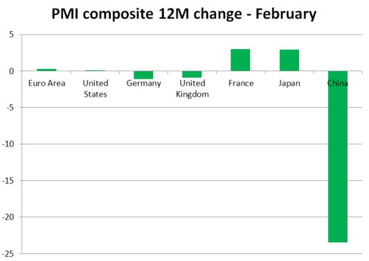 A feldolgozóipari beszerzési menedzser-index (melyben nagyobb súlyt kap a külső kereslet) "csak" 35,7 pontra süllyedt - de ez is a Kínában valaha mért legalacsonyabb érték és más országokban is csupán egy-egy recesszió legrosszabb hónapjaiban fordult elő. Még mindig van némi remény a kínai aktivitás gyors visszapattanására, de két dolgot érdemes észrevenni. Először is, a gyors visszapattanást lassíthatja, hogy a járvány Kínán kívül is terjedni kezdett, másodszor pedig nem tudjuk, hogy a régóta fennálló kínai egyensúlytalanságok közül (magas adósság, főleg a nagy állami cégeknél, ingatlanpiaci buborék) melyik zavarja meg utórengésekkel a gazdaságot.