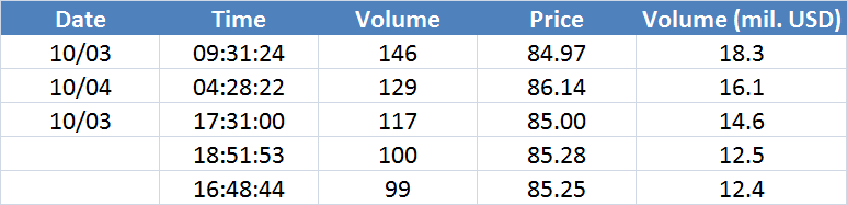 A legnagyobb volumenű tranzakciók az OIL (Brent) instrumentumon: