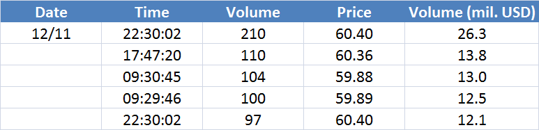 A legnagyobb volumenű tranzakciók az OIL (Brent) instrumentumon: