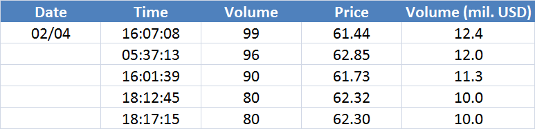 A legnagyobb volumenű tranzakciók az OIL (Brent) instrumentumon: