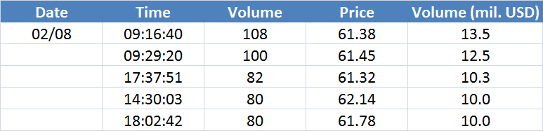 A legnagyobb volumenű tranzakciók az OIL (Brent) instrumentumon:
