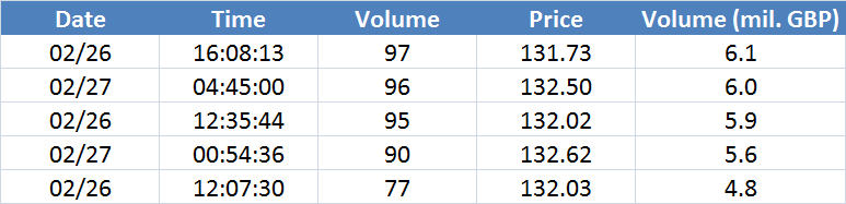A legnagyobb volumenű tranzakciók a GBPUSD devizapáron: