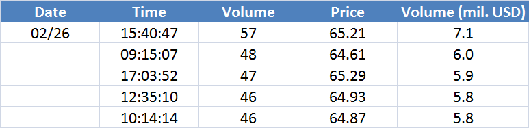 A legnagyobb volumenű tranzakciók az OIL (Brent) instrumentumon: