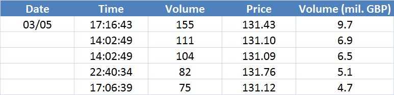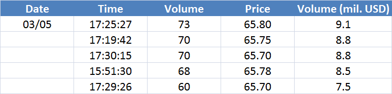 A legnagyobb volumenű tranzakciók az OIL (Brent) instrumentumon: