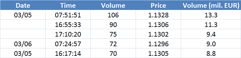 - legtöbb tranzakció az 1.1307 árszinten történt