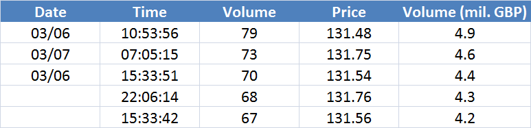 A legnagyobb volumenű tranzakciók a GBPUSD devizapáron: