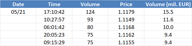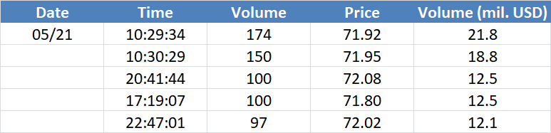 A legnagyobb volumenű tranzakciók az OIL (Brent) instrumentumon: