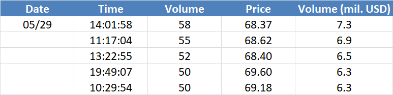 A legnagyobb volumenű tranzakciók az OIL (Brent) instrumentumon: