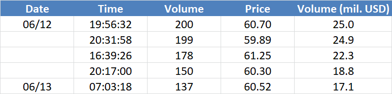 A legnagyobb volumenű tranzakciók az OIL (Brent) instrumentumon: