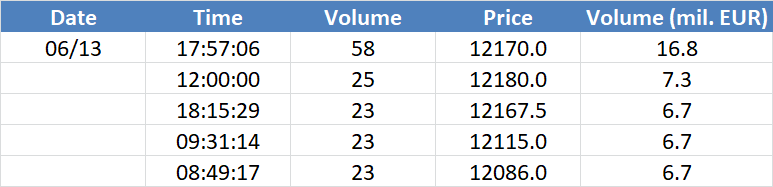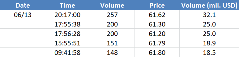 A legnagyobb volumenű tranzakciók az OIL (Brent) instrumentumon: