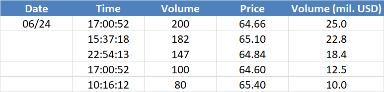 A legnagyobb volumenű tranzakciók az OIL (Brent) instrumentumon: