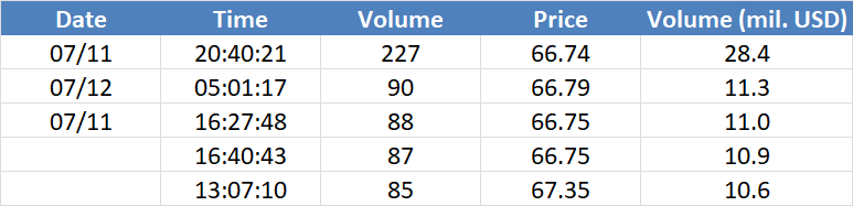 A legnagyobb volumenű tranzakciók az OIL (Brent) instrumentumon: