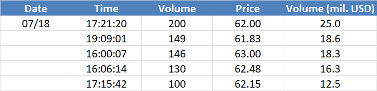 A legnagyobb volumenű tranzakciók az OIL (Brent) instrumentumon: