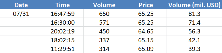 A legnagyobb volumenű tranzakciók az OIL (Brent) instrumentumon: