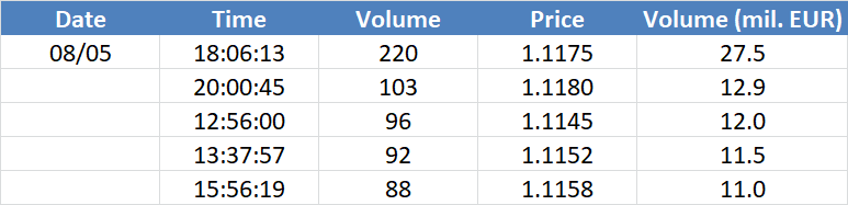 A legnagyobb volumenű tranzakciók a EURUSD devizapáron: