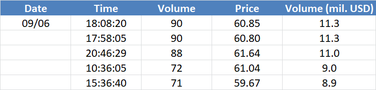 A legnagyobb volumenű tranzakciók az OIL (Brent) instrumentumon: