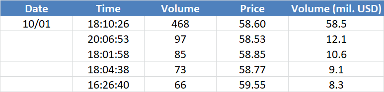 A legnagyobb volumenű tranzakciók az OIL (Brent) instrumentumon: