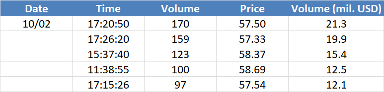 A legnagyobb volumenű tranzakciók az OIL (Brent) instrumentumon: