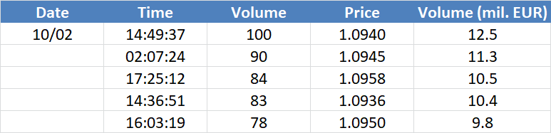 A legnagyobb volumenű tranzakciók a EURUSD devizapáron: