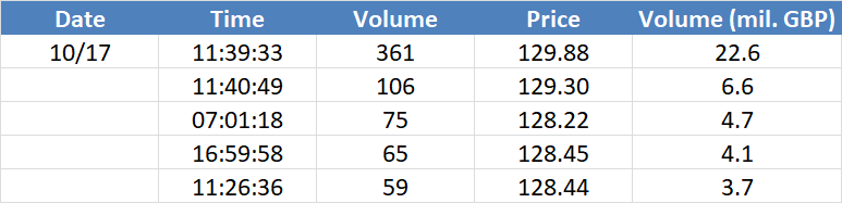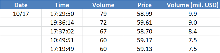 A legnagyobb volumenű tranzakciók az OIL (Brent) instrumentumon: