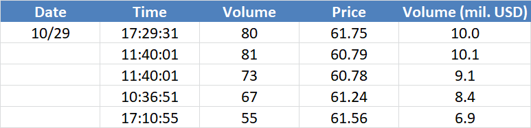 A legnagyobb volumenű tranzakciók az OIL (Brent) instrumentumon: