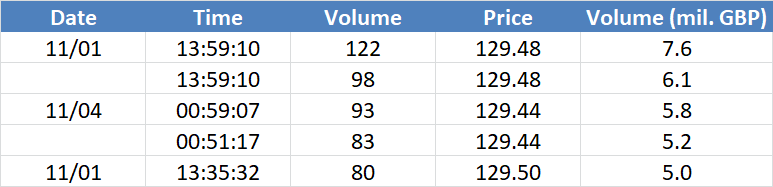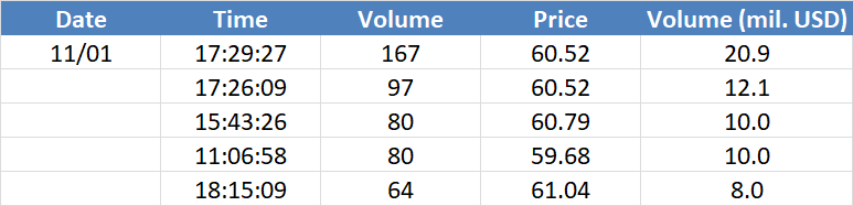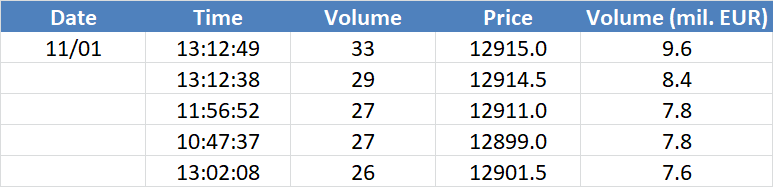 A legnagyobb volumenű tranzakciók az OIL (Brent) instrumentumon:
