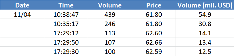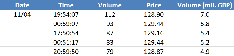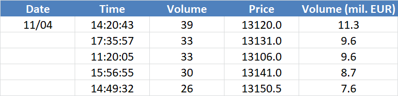 A legnagyobb volumenű tranzakciók az OIL (Brent) instrumentumon: