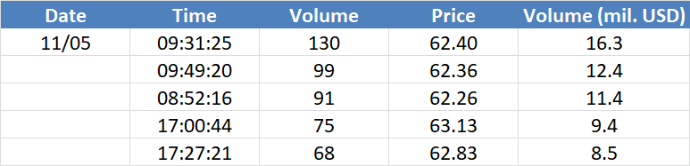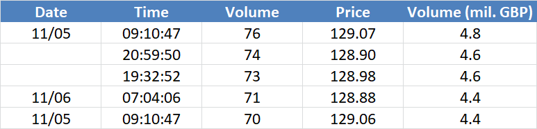A legnagyobb volumenű tranzakciók az OIL (Brent) instrumentumon: