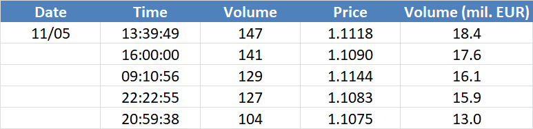 A legnagyobb volumenű tranzakciók a EURUSD devizapáron: